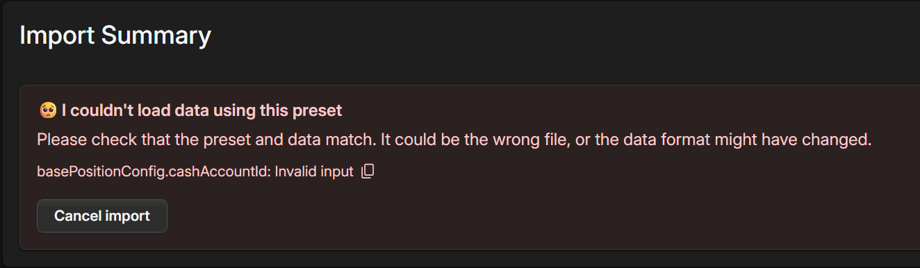 Nope, I created all accounts with their names and sub-account structure, but still the same error. Well, I have the source .json, so I can recreate the more obscure positions like deposits from scratch, while importing the rest from the brokerages.