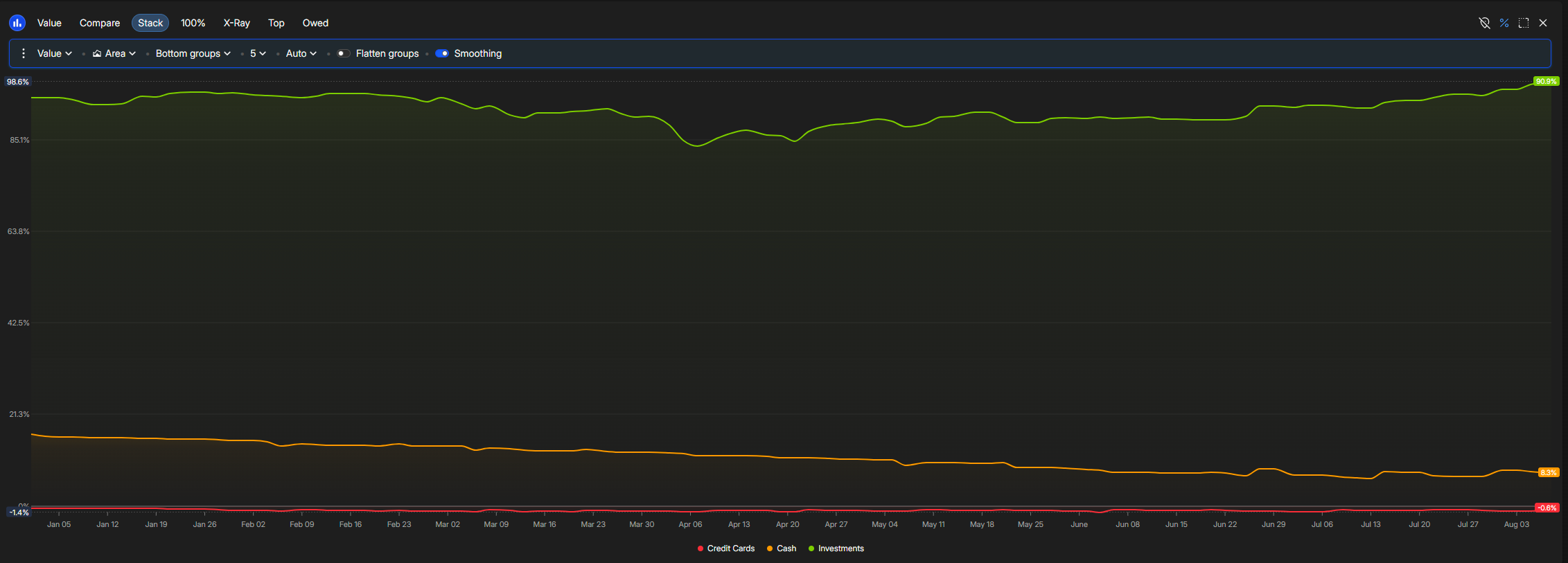 Area graphs like the default “Market Value:Stack” can create confusing output when one of the lines is a liabillity. If the liability line is not added first when creating the stack, the chart ends up showing a higher value on the top than the actual total.